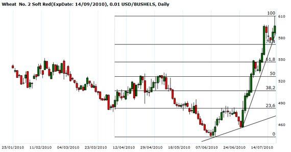 На пшеничном фронте — без перемен, в том смысле, что весь мир по-прежнему очень внимательно следит за всем, что происходит на полях и в правительстве России. Официально уже объявлено о 20%-ом сокращении российского урожая зерна. Прогнозируют, что россияне соберут не более 75 млн тонн. Не исключаются даже и 70 млн тонн. Однако для страны это не катастрофично, — в 1968 году зерна в России собрали 67 млн тонн, а в 1998 году – вообще 48 млн тонн. Вряд ли, конечно, сборы упадут до таких антирекордов, однако в масштабах мирового рынка это может означать весьма весомое сокращение переходящих остатков зерновых и, прежде всего, пшеницы. Нельзя не учитывать, что засуха в России и Казахстане только набирает обороты и температура почвы в пострадавших районах превышает 70 градусов. Можно чего-нибудь поджарить. Выбор широк: от хлеба до репутации.