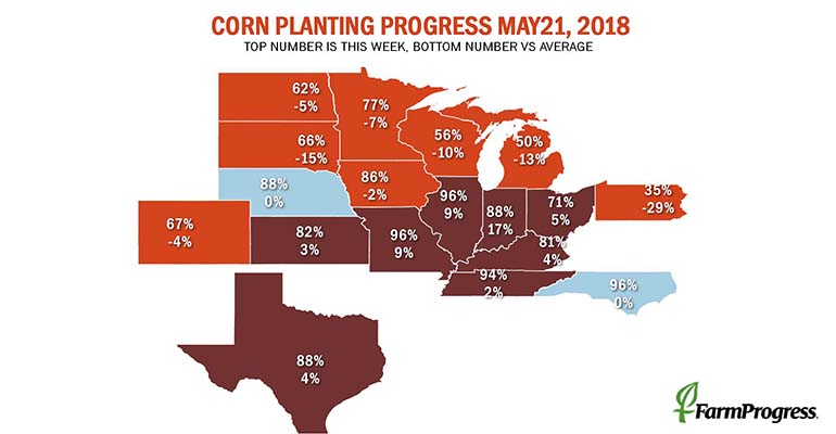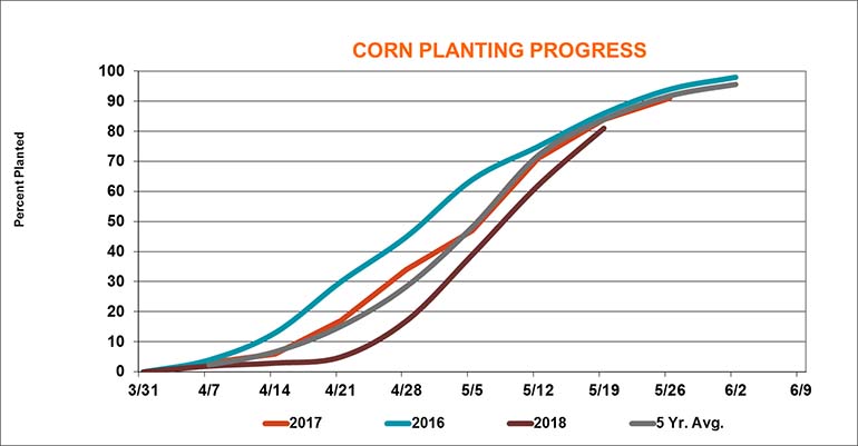 В целом, еще одна неделя прошла довольно эффективно, было высажено около 19% кукурузы. Текущее положение полностью соответствует темпам 2017 года, составляющим 82%, и пятилетнему среднему показателю в 81%.