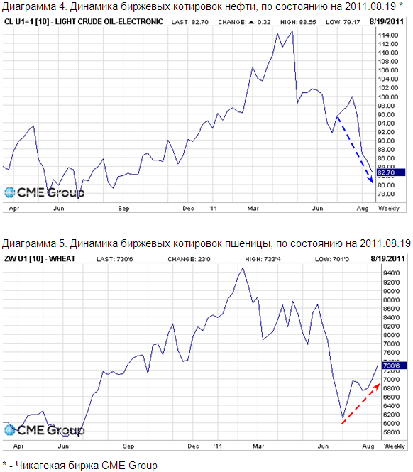 Как говорится, “незнание не освобождает от ответственности” и наше дело предупредить, что при такой финансово – экономической политике нам к 2013 году может “башню снести”, как у танка детонацией боекомплекта при попадании кумулятивного заряда в незащищённый стык между башней и корпусом. Если следите за нашими публикациями, позвольте вам напомнить, что в конце прошлого года мы предупреждали о возможной второй волне кризиса, которая для “потусторонних сил” может послужить прикрытием для розыгрыша стратегической комбинации нефть — вниз, зерно — вверх. Для нашей страны это убойный сценарий и насколько он вероятен, позвольте проиллюстрировать на примере динамики биржевых котировок нефти и зерна: