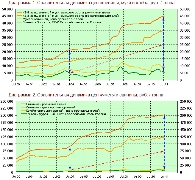 * Синие стрелки — разница между ценой реализации зерна и розничной ценой ХБИ и мяса