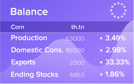 В новом отчете WASDE Министерства Сельского Хозяйства США прогнозируемый объем производства кукурузы в Европейском союзе в 2018/19 году значительно повышен на 2,125 млн. тонн до 63 млн. тонн, что на 0,9 млн. тонн или 1,44 процента больше по сравнению с прошлым годом. Увеличение прогноза произошло за счет повышения урожайности с 7,55 тонн на гектар до 7,62 т/га и увеличения площади с 8,07 до 8,26 миллиона гектаров. Прогноз импорта кукурузы в ЕС для 2018/19 года в этом месяце повышен на 1 млн. тонн до 22,5 млн. тонн на базе текущих быстрых темпов торговли. Прогноз экспорта увеличен на 500 тыс. тонн до 2 млн. тонн в связи с увеличением ожидаемого урожая.