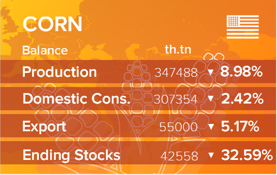 Прогноз для кукурузы США на 2019/20 год в этом месяце связан с увеличением начальных запасов и импорта, резким сокращением производства, сокращением кормового и остаточного потребления и экспорта, а также уменьшением конечных запасов. Начальные запасы повышены в результате сокращения прогнозируемого экспорта 2018/19 года на 100 млн. бушелей до 2,2 млрд. бушелей, что обусловлено текущими объемами продаж и снижением ценовой конкурентоспособности США. Прогнозируется, что производство кукурузы в 2019/20 году сократится на 1,4 млрд. бушелей до 13,7 млрд., что станет самым низким уровнем с 2015/16 года.