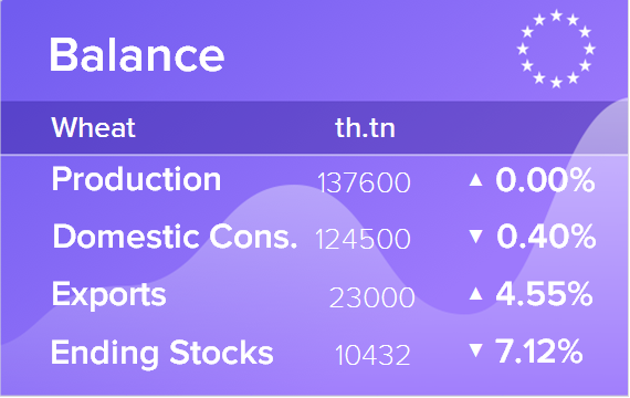 За прошедший месяц министерство сельского хозяйства США (USDA) на 08.03.2019 пересмотрело Баланс пшеницы для ЕС в сезоне 18/19 следующим образом: