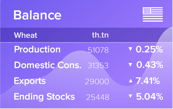 В августовском отчете WASDE Министерство сельского хозяйства США повысило свой прогноз экспорта пшеницы из США в 2018/19 маркетинговом году с 27 млн. тонн до 29 млн. тонн, обосновав это повышение ростом конкурентоспособности американского зерна на фоне сокращения урожая в Европейском союзе. Прогноз производства пшеницы в США в 2018/19 году при этом снижен по сравнению с предыдущим отчетом WASDE с 51,205 млн. тонн до 51,078 млн. тонн. В результате прогноз конечных запасов пшеницы на 2018/19 год также снижен с 26,8 до 25,448 млн. тонн.