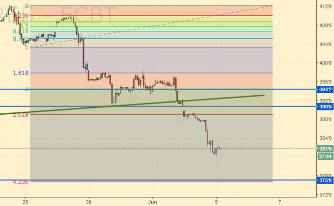 Продажа: при касании 390.0. Стоп: 396.0. Цель: 360.0. Кто в позиции, перенесите стоп на 394.0. Цель: 360.0.