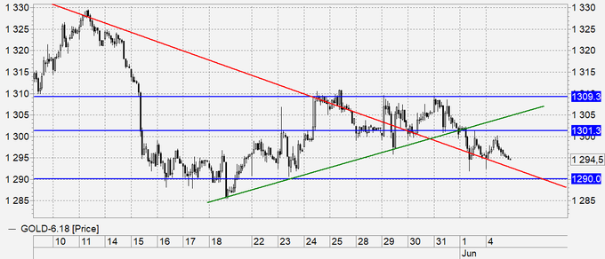Золото: золото спускается вниз. Быкам неоткуда взять идеи, которые бы сплотили их. В случае падения ниже 1290 рынок начнет более быстрое движение вниз в район 1250. В теории разворот вверх возможен, но он будет лишь в случае, если ставка ФРС США не будет повышена 13 июня.