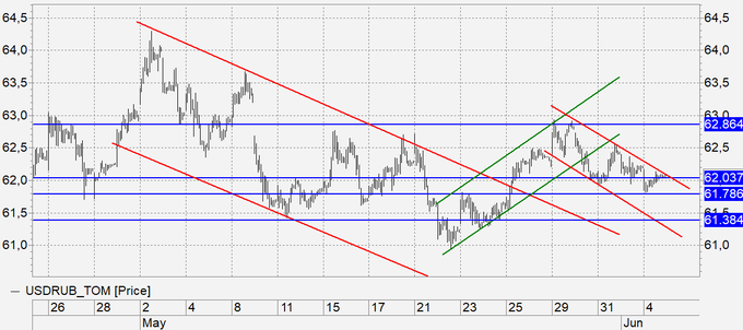 Рубль: пока мы стоим в районе 62.00 в падающем ценовом канале. Время работает против медведей, им нужно толкать рынок вниз для того, чтобы продолжать находиться внутри канала, а они не могут этого сделать. Сегодня мы увидим прорыв выше 62.10 и рост до 62.50 – это самый спокойный сценарий. В случае падения Brent ниже 74.70 отметка 65.00 рублей за доллар будет достигнута очень быстро (четыре – пять дней).