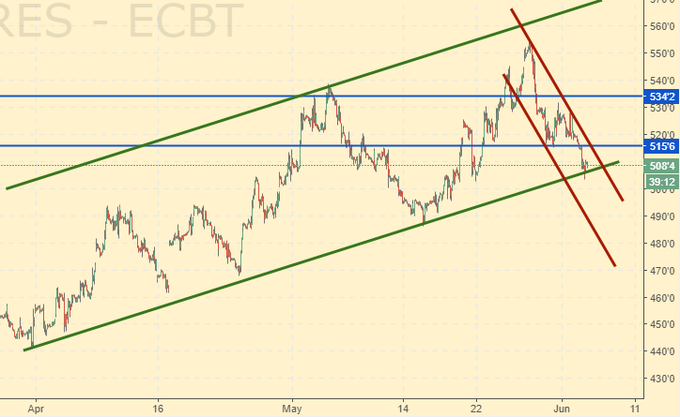 Пшеница: если вы хотите увидеть, как выглядит бессилие – посмотрите на рынок пшеницы. На фоне укрепления доллара и высоких ожиданий нового урожая цены так и не смогли реализовать нашу мечту с походом на 590.0. Ситуация для быков плоха, микроскопические шансы есть на разворот и завершение коррекции пока рынок выше психологической отметки 500.0, но глядя на падение нефти, невзрачность золота и падение кукурузы – покупать не хочется абсолютно. Можно ли здесь продавать? Здесь нет. Только при росте к отметке 515.0.