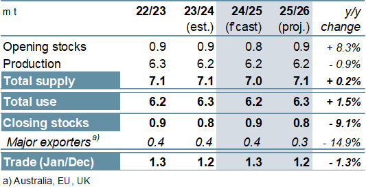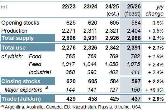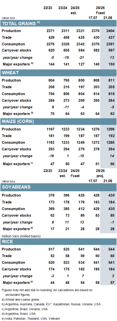 Прогнозируемый рост общего объема производства зерновых в 2025/26 году на 83 млн тонн в годовом исчислении включает увеличение урожая кукурузы (+65 млн тонн в годовом исчислении), пшеницы (+11 млн тонн), ячменя (+3 млн тонн), сорго (+2 млн тонн) и овса (+1 млн тонн). На фоне рекордных поставок и связанного с этим ценового давления прогнозируется ускорение роста мирового потребления, которое превысит прошлогодний показатель на 49 млн тонн. После трех последовательных сокращений запасы на конец года могут увеличиться на 13 млн тонн, но запасы по-прежнему будут ниже среднего уровня. По прогнозам, объем торговли увеличится до 437 млн тонн (+12 млн тонн), включая более крупные поставки пшеницы (+8 млн тонн) и кукурузы (+5 млн тонн).