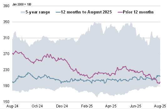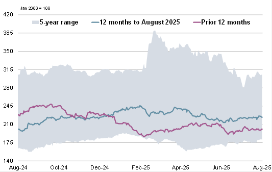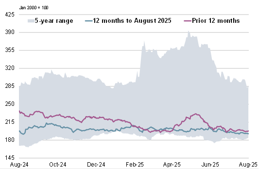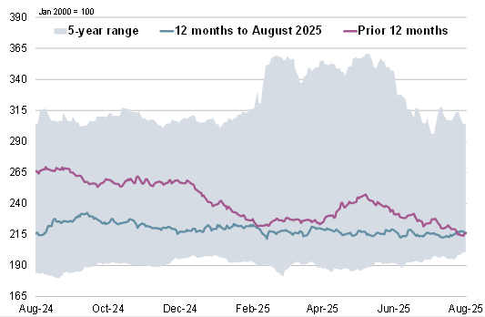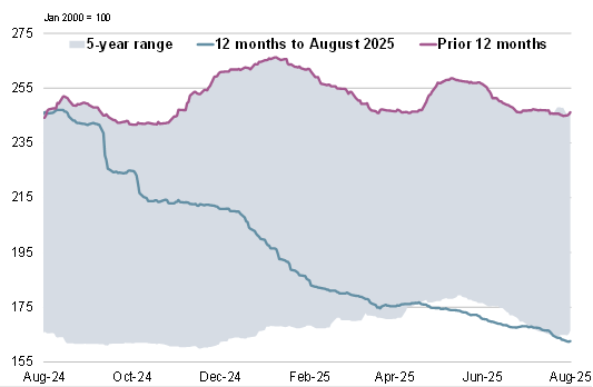 В связи с незначительным снижением прогноза по производству в США, что более чем компенсируется повышением прогнозов по другим странам, прогноз мирового производства соевых бобов на 2025/26 год немного повышен — до 430 млн т, что на 1% больше, чем в прошлом году; чистый прирост предложения в месячном исчислении связан с увеличением показателей по соевым бобам в следующем году. Ожидается, что объем торговли увеличится на 1 млн тонн по сравнению с июлем, достигнув нового пика (+2% г/г).
