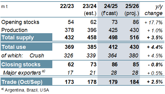 После года рекордных поставок, спроса и торговли соей, в 2025/26 году прогнозируется новый пик производства. На фоне предварительных прогнозов роста производства южноамериканских культур мировое производство ожидается на уровне 430 млн тонн (+1%), в то время как расширение переработки в Азии, Северной и Южной Америке и Африке, как ожидается, обеспечит прирост потребления на 4% в годовом исчислении, поскольку совокупные запасы снижаются. Объем торговли, по прогнозам, достигнет нового максимума (+2%).