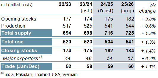 После значительного роста в предыдущем году мировое производство риса, по прогнозам, достигнет пика в 2025/26 году, в основном за счет роста в трех основных отраслях. Учитывая значительные начальные запасы, прогнозируются рекордные поставки; наряду с дальнейшим увеличением мирового потребления (особенно белых сортов), ожидается дальнейший рост остатков. Ожидается, что в 2026 году объем торговли достигнет 60 млн тонн.