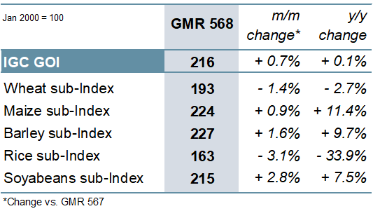 На фоне роста экспортных цен на сою и кукурузу индекс IGC по зерновым и масличным культурам (GOI) незначительно вырос в месячном исчислении, не изменившись по сравнению с прошлым годом.