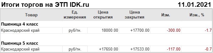 Сегодня в 12:30 Мск, завершились торги на ЭТП IDK.ru по пшенице 4-го класса, базис поставки Краснодарский край. Цены упали на 300 рублей до 17700 рублей за тонну.