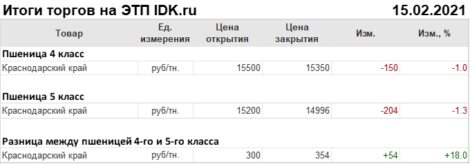Сегодня в 12:30 Мск, завершились торги на ЭТП IDK.ru по пшенице 4-го класса, базис поставки Краснодарский край. Цены упали на 150 рублей до 15350 рублей за тонну.