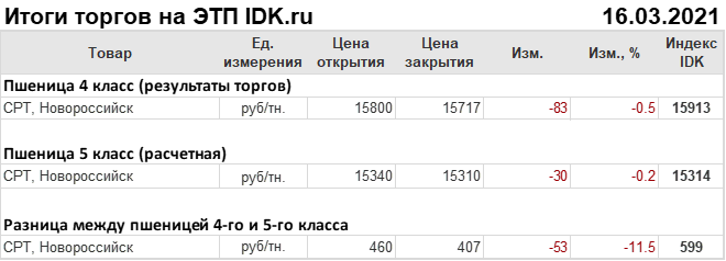 Цены в течение торгов снизились на 83 рубля на пшеницу 4-го класса по сравнению с предыдущим закрытием.