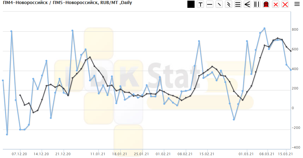 Голубая линия — разница между ценой пшеницы 4-го и 5-го класса.