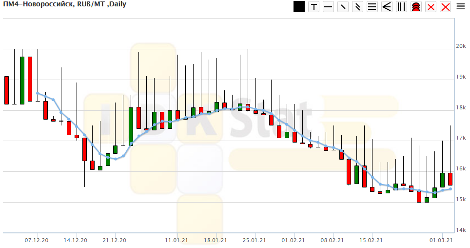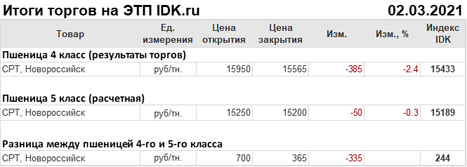 Цены в течение торгов снизились на 385 рублей на пшеницу 4-го класса по сравнению с предыдущим закрытием.