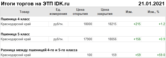 Сегодня в 12:30 Мск, завершились торги на ЭТП IDK.ru по пшенице 4-го класса, базис поставки Краснодарский край. Цены выросли на 215 рублей до 18215 рублей за тонну.