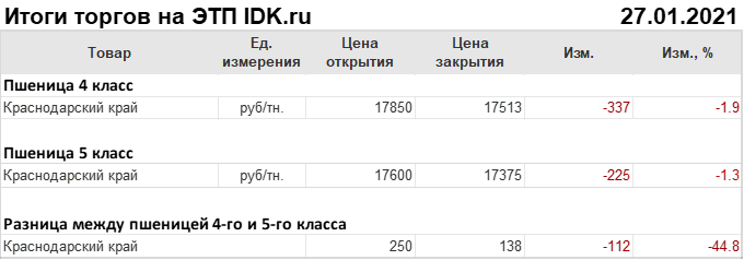 Сегодня в 12:30 Мск, завершились торги на ЭТП IDK.ru по пшенице 4-го класса, базис поставки Краснодарский край. Цены упали на 337 рублей до 17513 рублей за тонну.