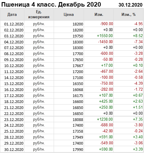 Пшеница 4-го класса, базис поставки Краснодарский край. С начала месяца цены упали на 210 рублей до 17990 рублей за тонну.