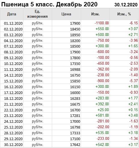 Пшеница 5-го класса, базис поставки Краснодарский край. С начала месяца цены упали на 258 рублей до 17642 рублей за тонну.