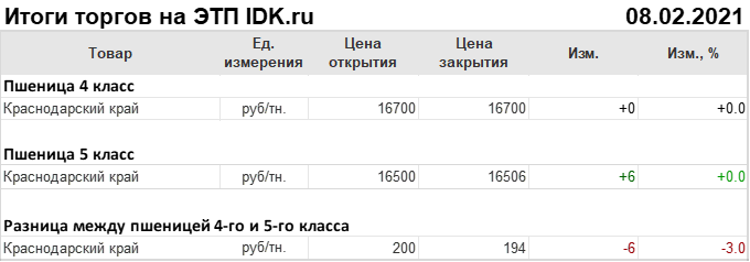 Сегодня в 13:00 Мск, завершились торги на ЭТП IDK.ru по пшенице 5-го класса, базис поставки Краснодарский край. Цены выросли на 6 рублей до 16506 рублей за тонну.