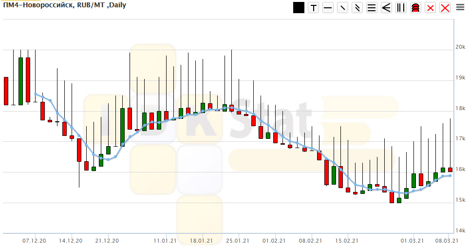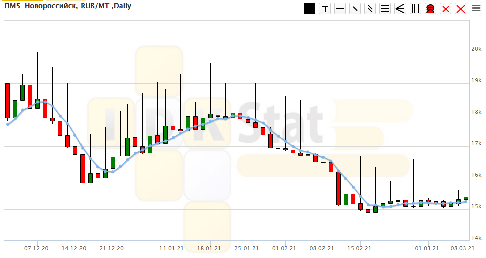 Цены в течение торгов снизились на 131 рубль на пшеницу 4-го класса по сравнению с предыдущим закрытием.