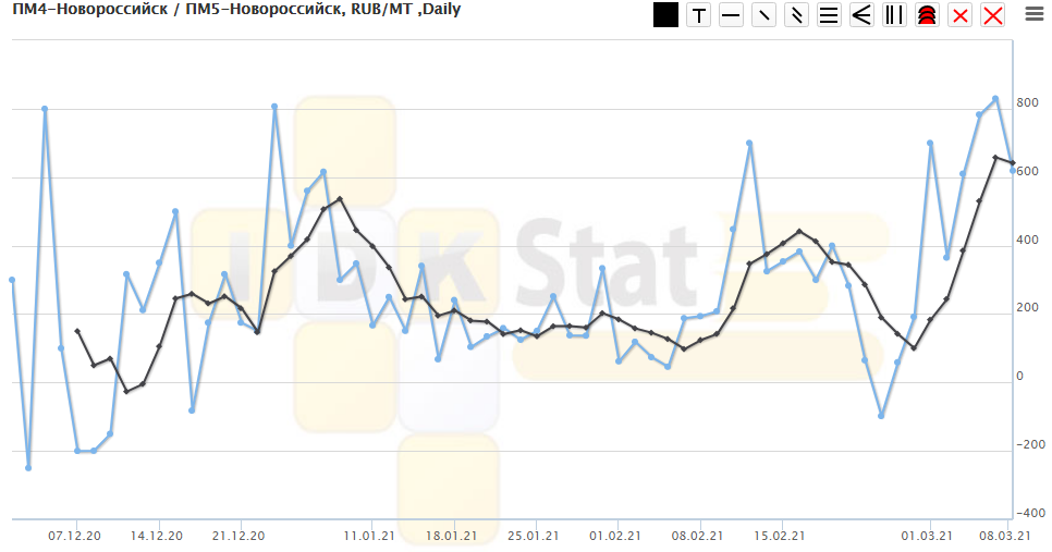 Голубая линия — разница между ценой пшеницы 4-го и 5-го класса.