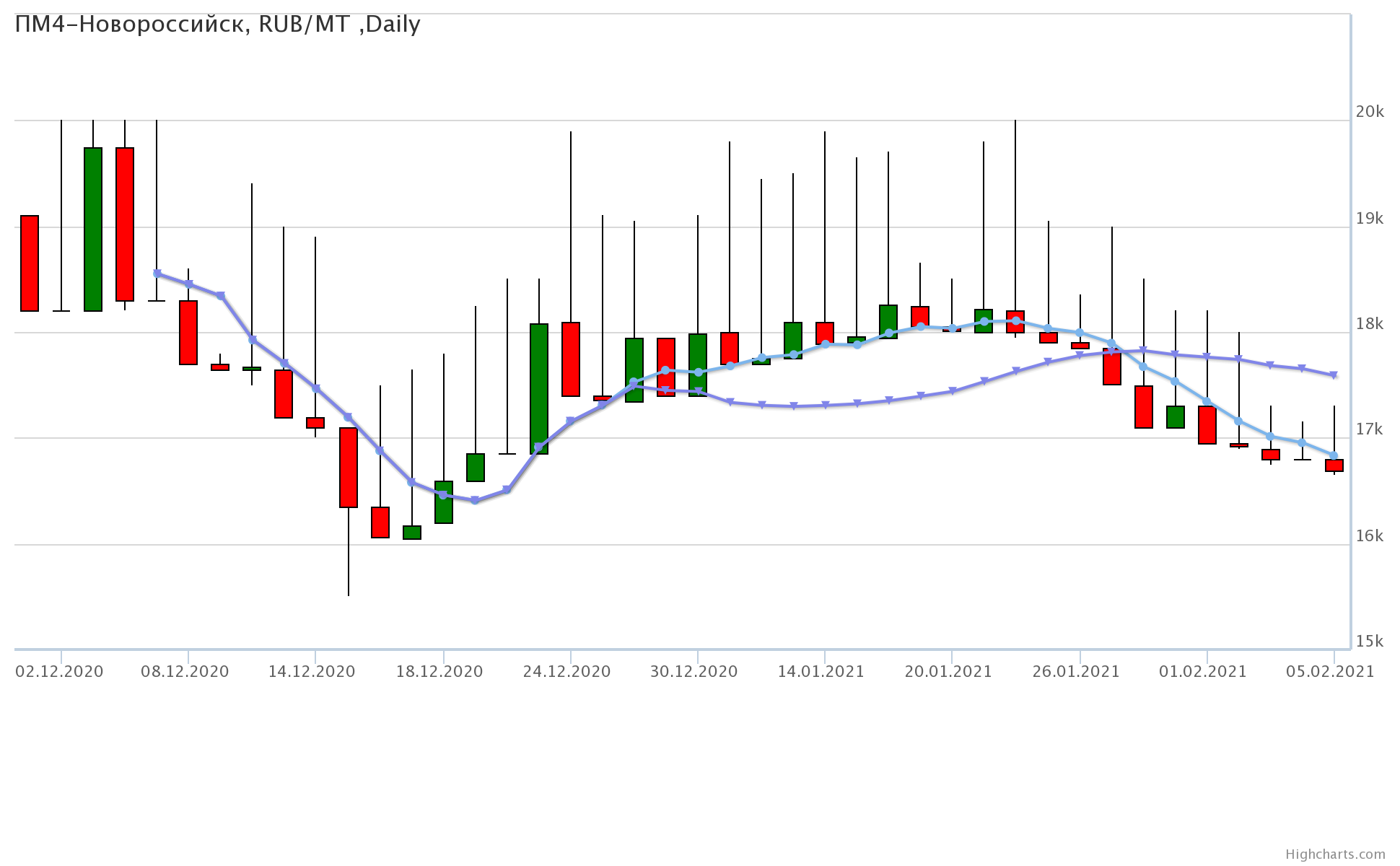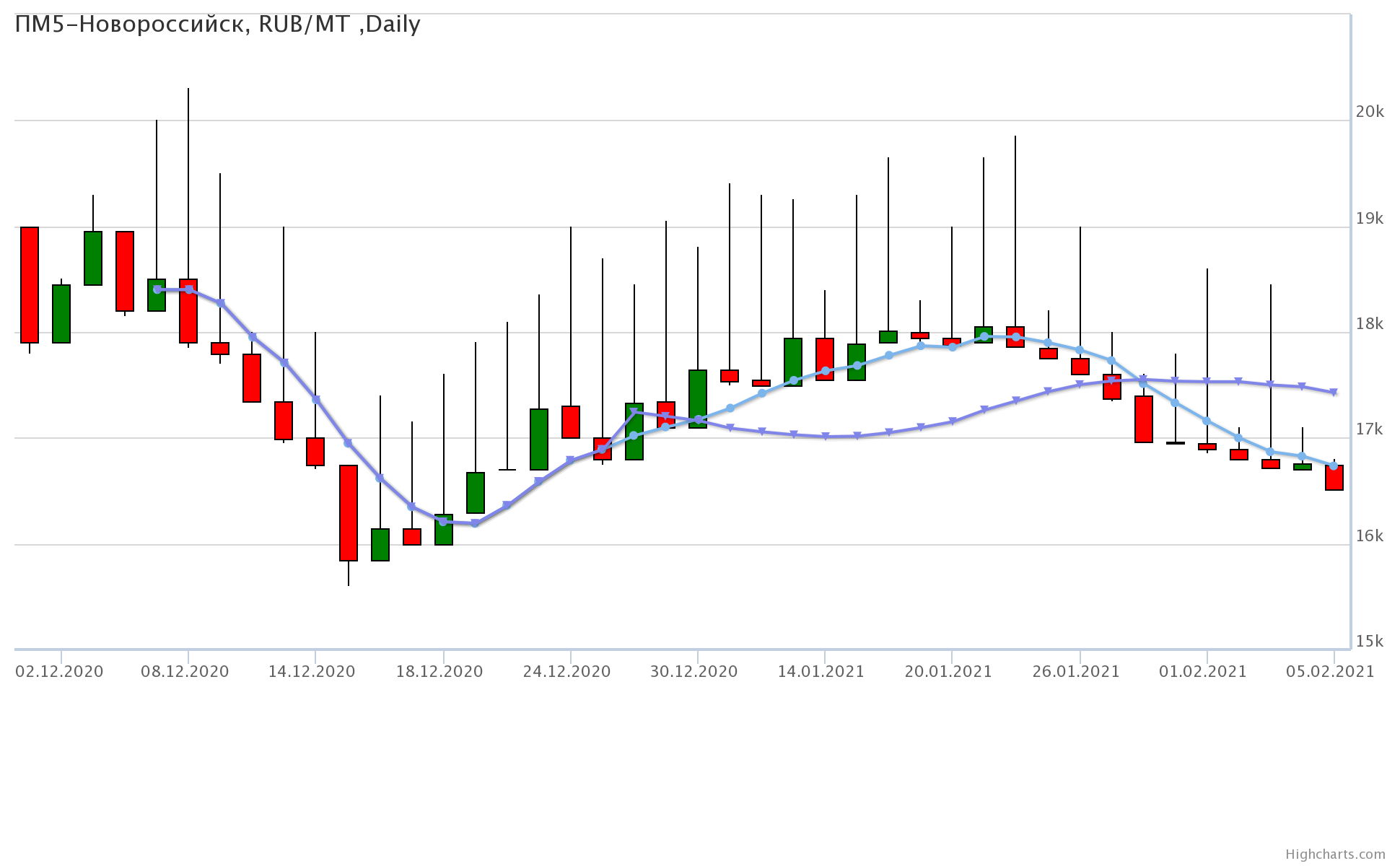 Цены на пшеницу 5-го класса, базис поставки Краснодарский край, за неделю упали на 1300 рублей до 16750 рублей за тонну.