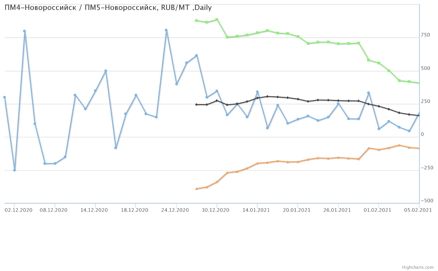 Разница цен между пшеницей 4-го и 5-го класса, базис Новороссийск