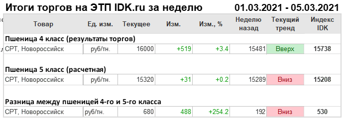 Цены в течение недели выросли на 519 рублей на пшеницу 4-го класса по сравнению с закрытием предыдущей недели.