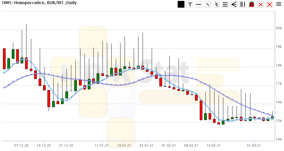 На графиках пшеницы 4-го и 5-го класса показаны два индикатора SMA (Simple Moving Average, «простое скользящее среднее») с периодами 5 и 20. Данные индикаторы применяются для определения направления текущего тренда. Тренд направлен вверх, если SMA(5) находится выше SMA(20). Тренд направлен вниз, если SMA(5) находится ниже SMA(20).