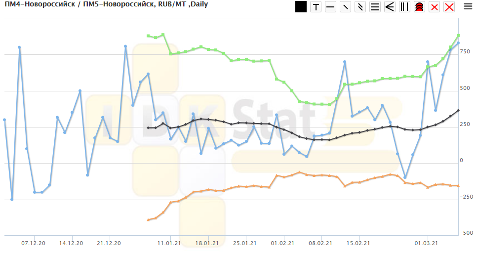 Разница цен между пшеницей 4-го и 5-го класса, базис Новороссийск