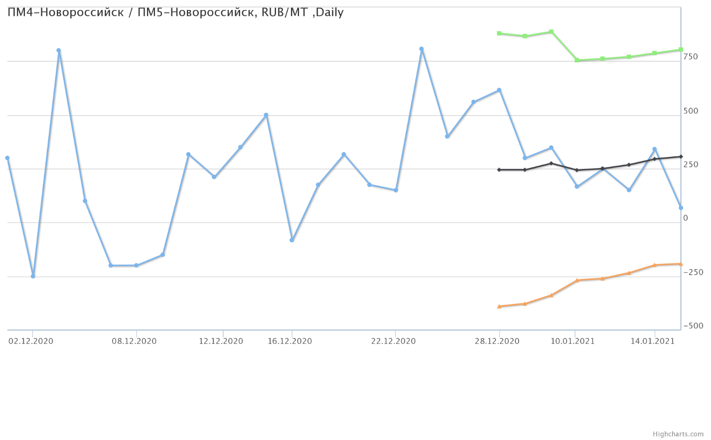 Разница цен между пшеницей 4-го и 5-го класса, базис Новороссийск