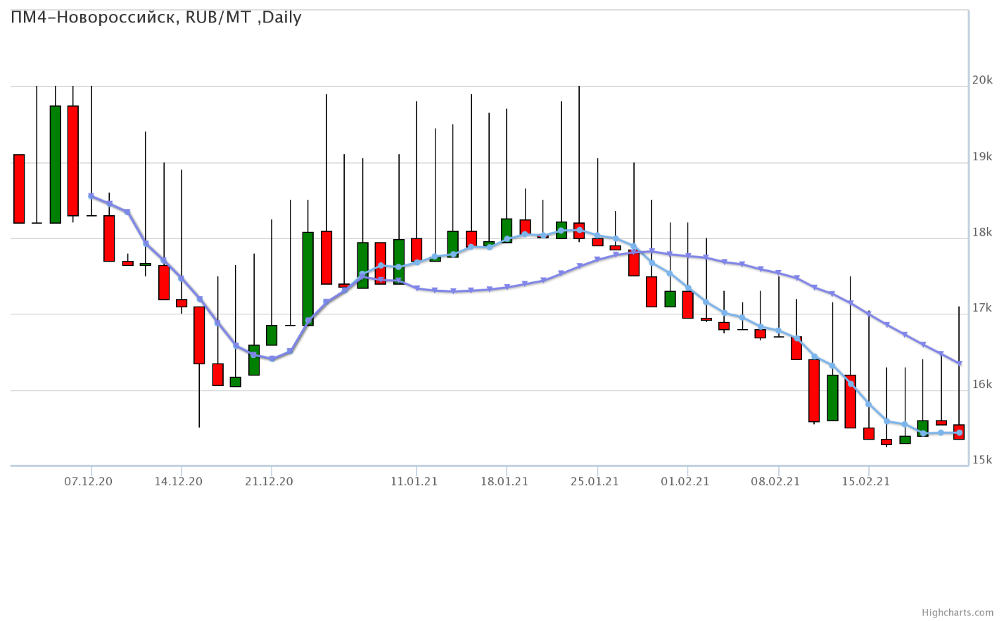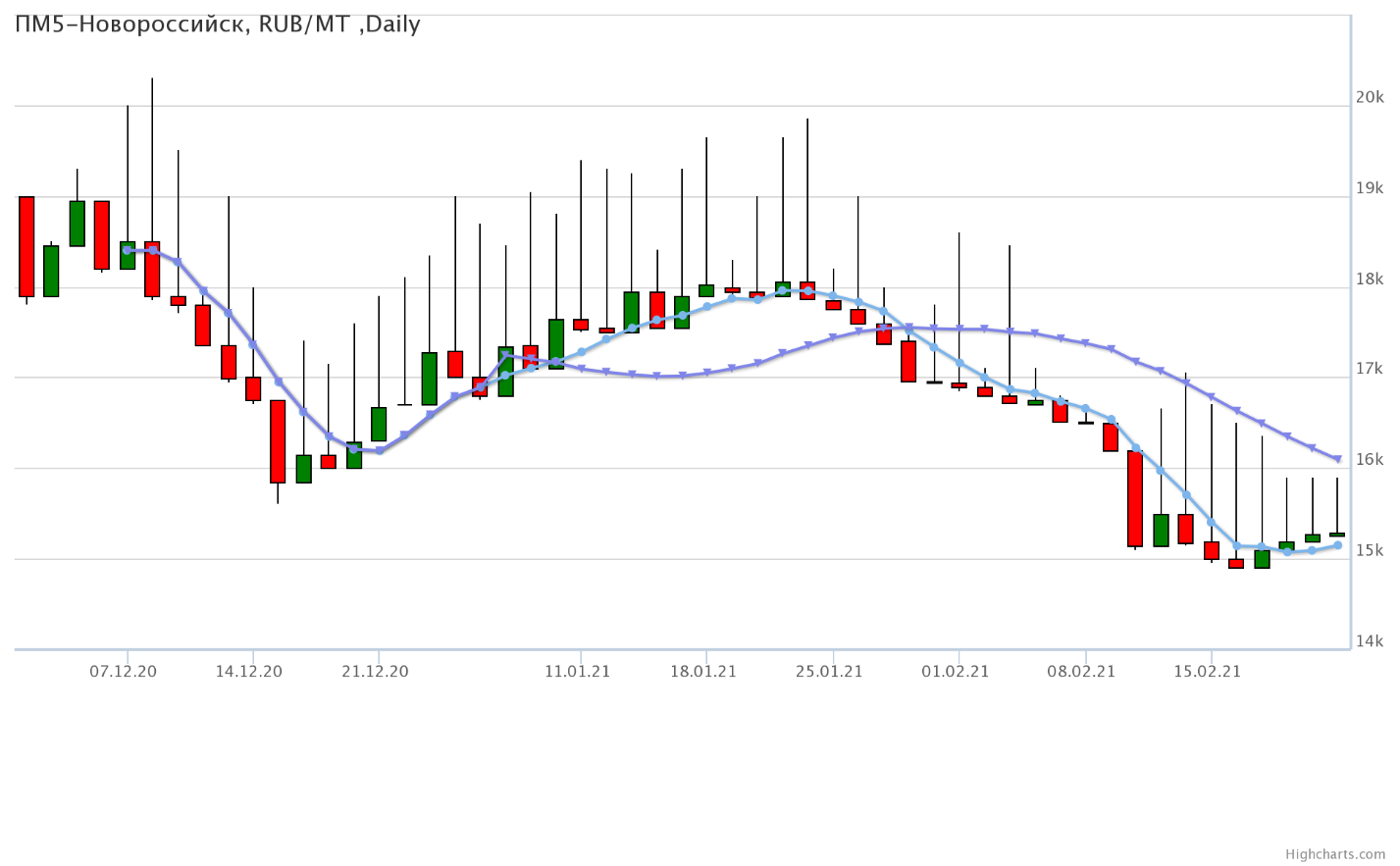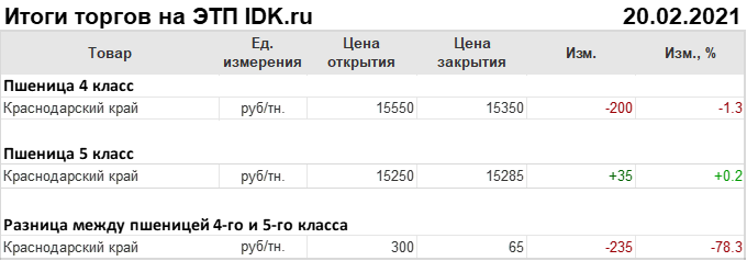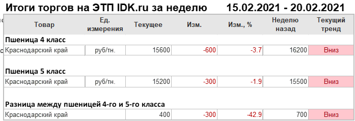 Цены в течение недели снизились на 600 рублей на пшеницу 4-го класса и снизились на 300 рублей на пшеницу 5-го класса по сравнению с закрытием предыдущей недели.