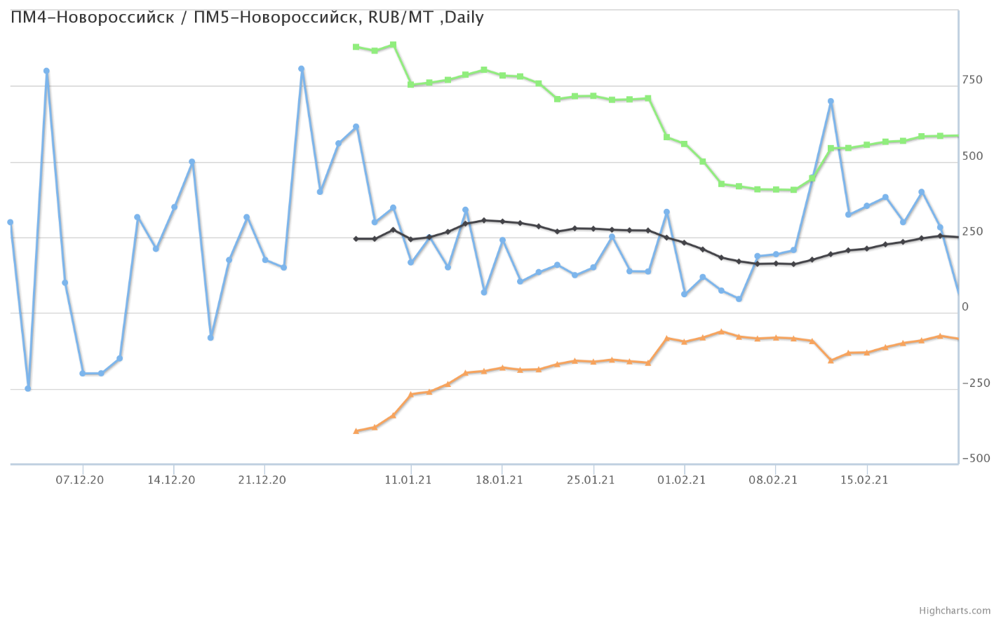 Разница цен между пшеницей 4-го и 5-го класса, базис Новороссийск