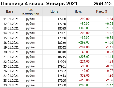 пшеница 4-го класса, базис поставки Краснодарский край. С начала месяца цены упали на 400 рублей до 17300 рублей за тонну.