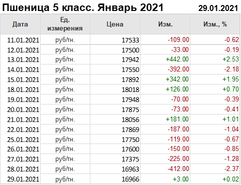 Пшеница 5-го класса, базис поставки Краснодарский край. С начала месяца цены упали на 567 рублей до 16966 рублей за тонну.