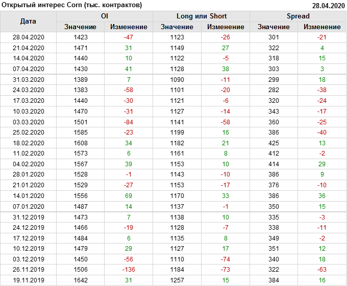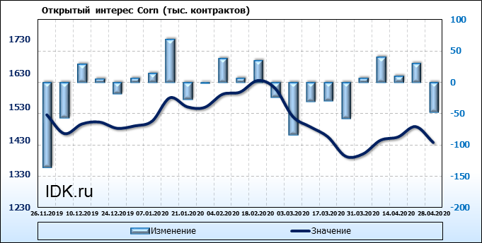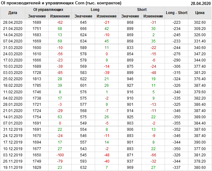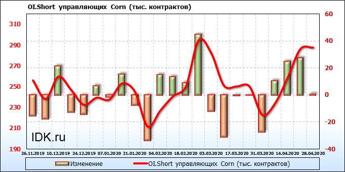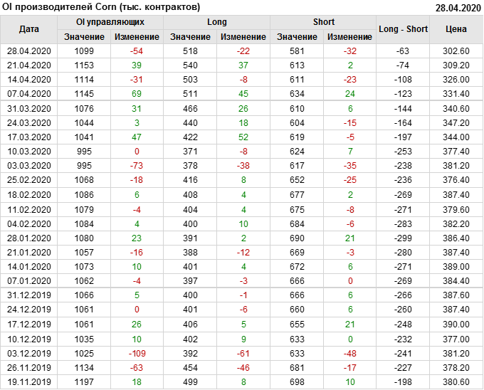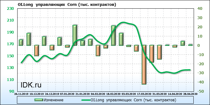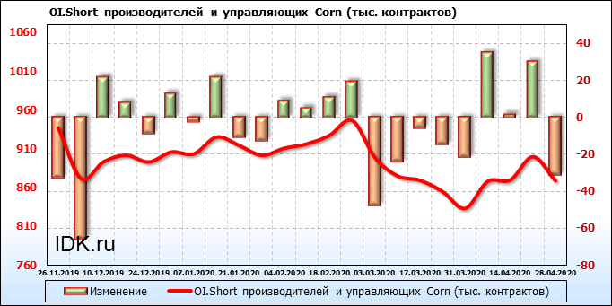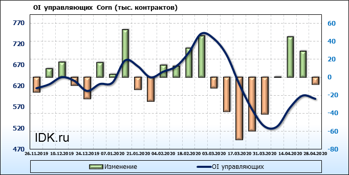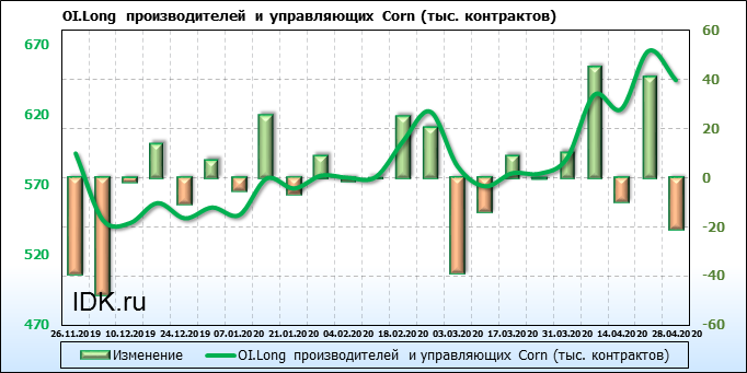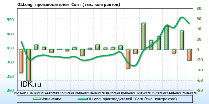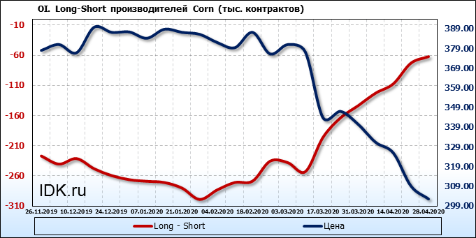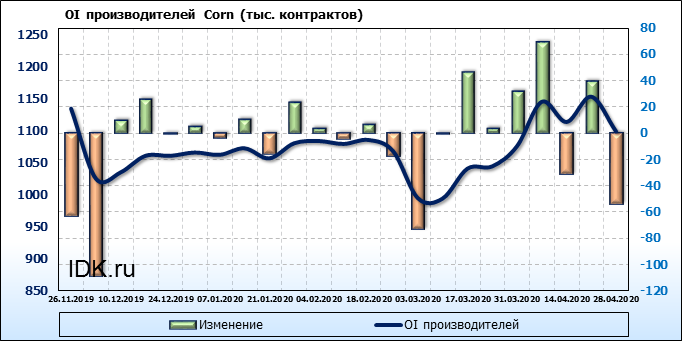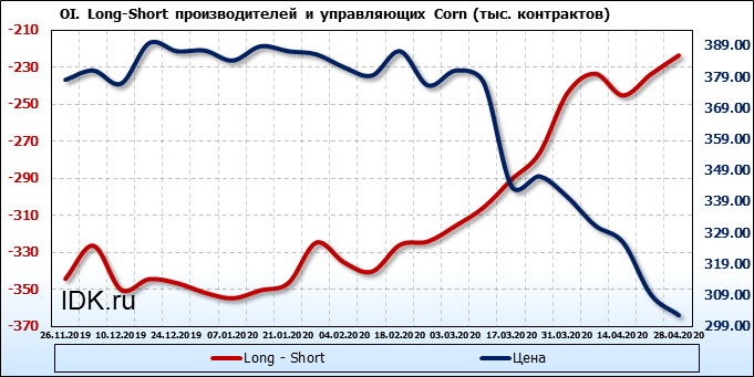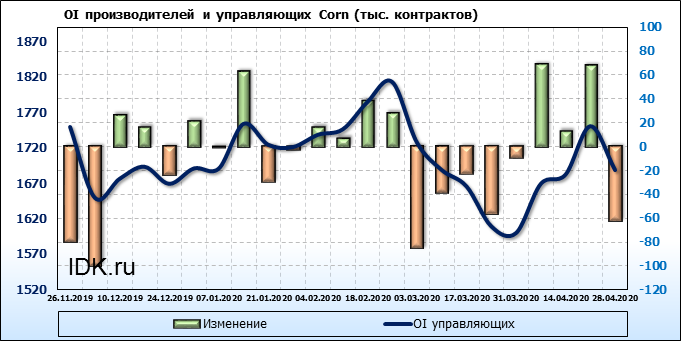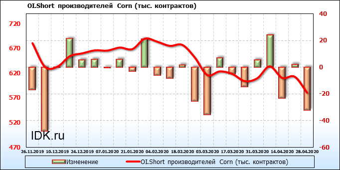 За прошлую неделю, 22.04.20 — 28.04.20, разница между длинными и короткими позициями производителей выросла на 11 тыс. контрактов. В тоже время, цена упала на 6.6 цента. Производители перестали наращивать короткие позиции, что говорит или о непривлекательности текущих ценовых уровней для хеджирования, или о том, что часть участников рынка заняла выжидательную позицию.