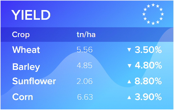 Исключительно жаркие и/или засушливые погодные условия в значительной части Европы продолжают существенно снижать прогноз урожайности яровых культур в ЕС. Это особенно заметно в отношении зерновой кукурузы (-8,6% на уровне ЕС), подсолнечника (-5,5%) и соевых бобов (-9,6%). Наоборот, эти условия благоприятствовали уборке озимых культур, что способствовало некоторому улучшению прогноза урожайности этих культур.