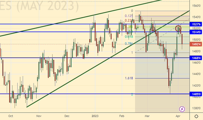 Growth scenario: we are considering the May futures, the expiration date is April 26. Our attempts to enter the long do not bring results. The market continues to fall. We take a break in trading for a week.