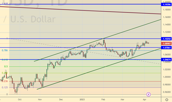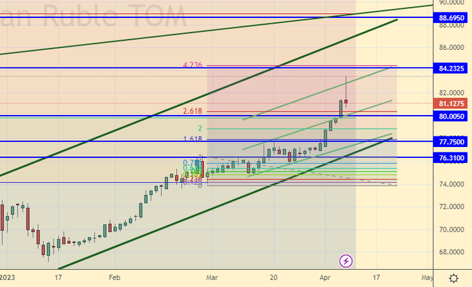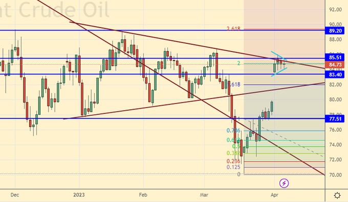 Growth scenario: we are considering the April futures, the expiration date is April 28. We see a big gap at 85.50 on Monday. Most likely it will be closed. The only question is when. Now or after the move to 89.20.