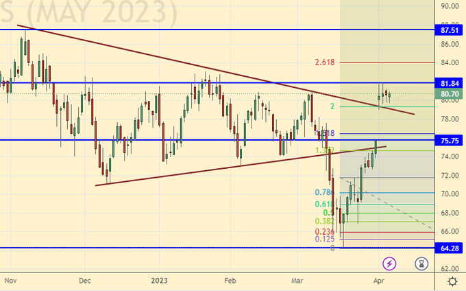 Growth scenario: we are considering the May futures, the expiration date is April 20. The market went up to 81.80. Current levels for purchases are not interesting. If we fall to 75.00, we can go long.