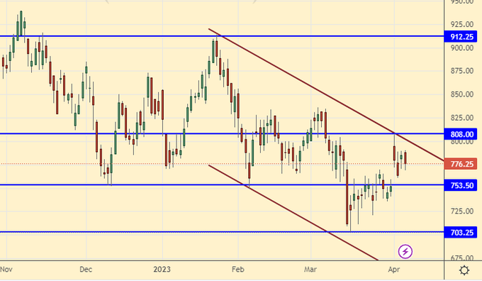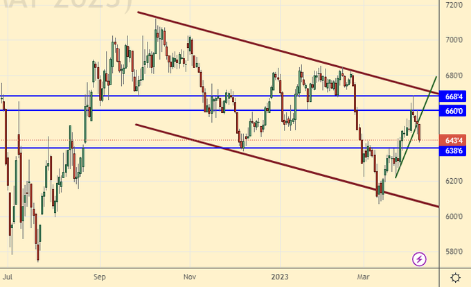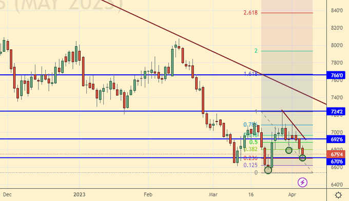 Growth scenario: consider the May futures, the expiration date is May 12. Extremely attractive picture for shopping. It makes sense to enter with slightly larger volumes than usual. Target 765.0 cents per bushel.