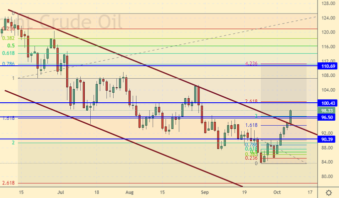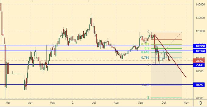 Growth scenario: consider the October futures, the expiration date is October 31. Most likely we will touch the 100.00 level and retreat down for a few days. In this situation, it makes sense to wait for a correction to the level of 95.00 and buy.