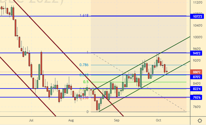 Growth scenario: consider the December futures, the expiration date is December 14th. If support at 870.0 fails, the market will drop to 825.0 cents per bushel. Until we buy.