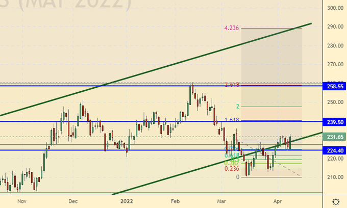 Growth scenario: we are considering the May futures, the expiration date is May 18. The market does not want to fall. In case of growth above 235.0, you can increase the previously opened longs.