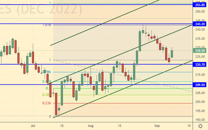 Growth scenario: consider the December futures, the expiration date is December 19. The assumption that the market could not fall below 220.0 turned out to be correct. We hold longs.