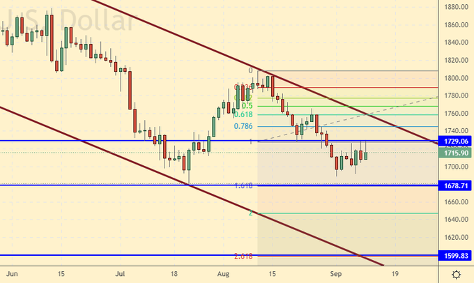 Fall scenario: continue to hold shorts. We are counting on a fall to the level of 1600. Strong resistance at 1730 is noteworthy.